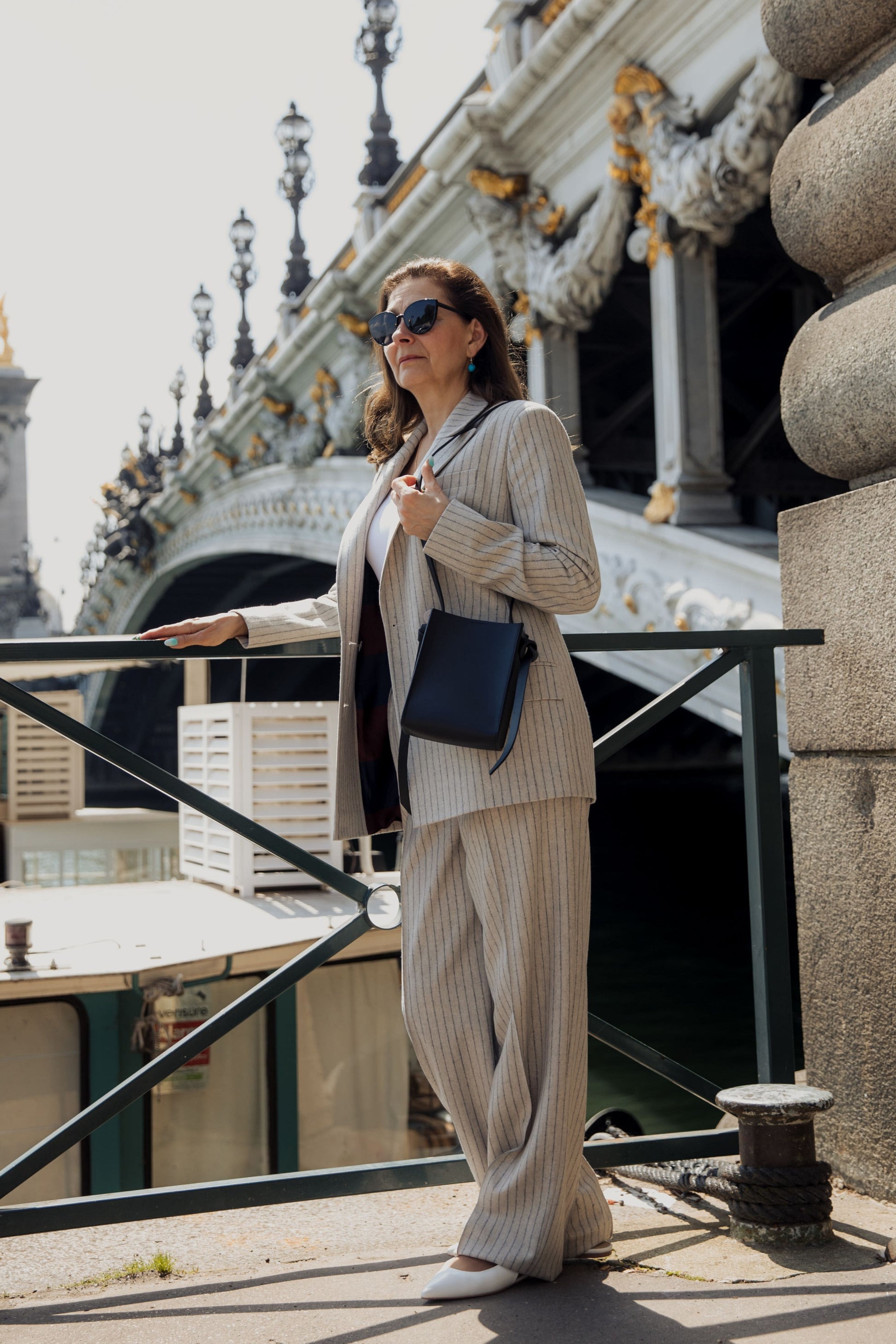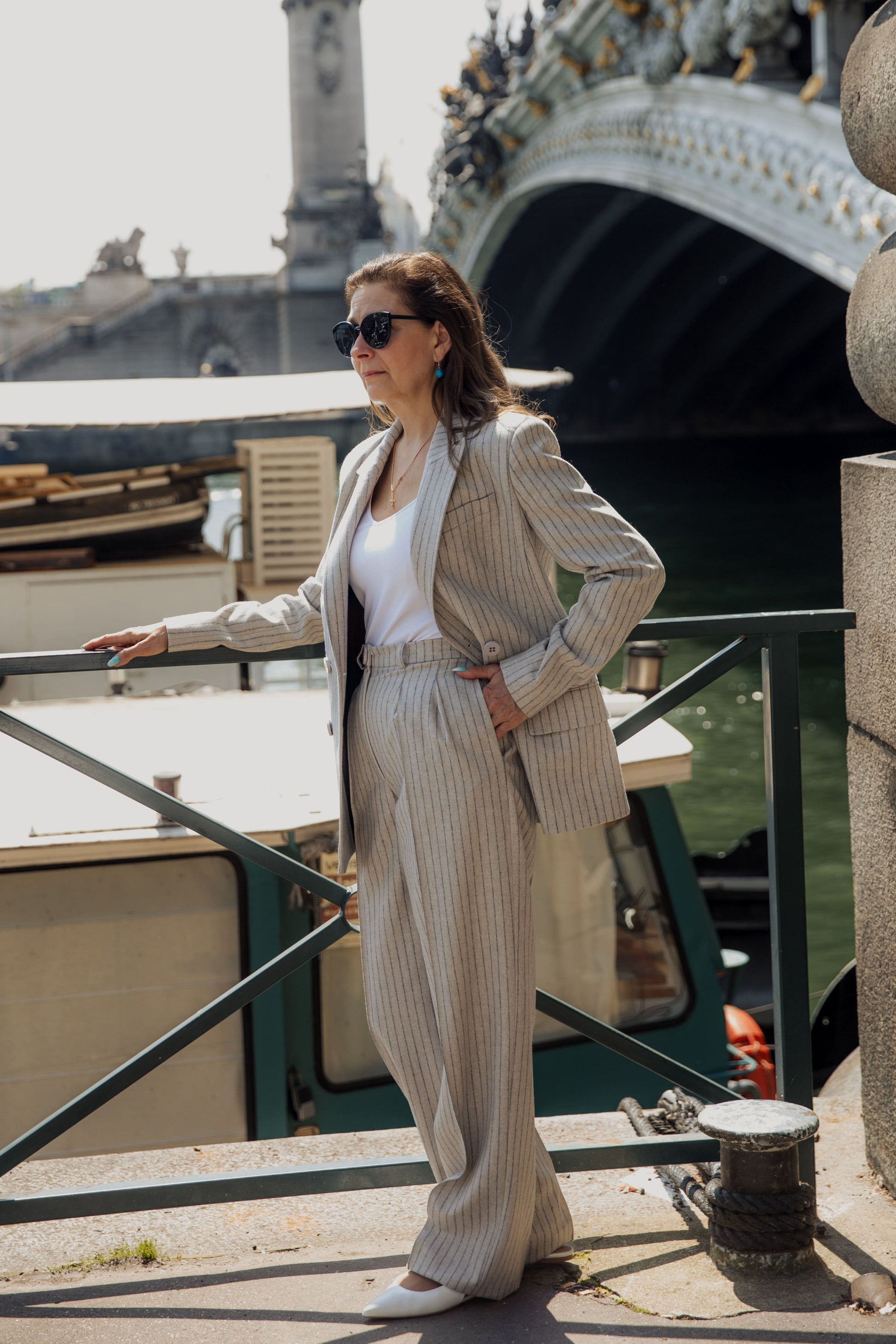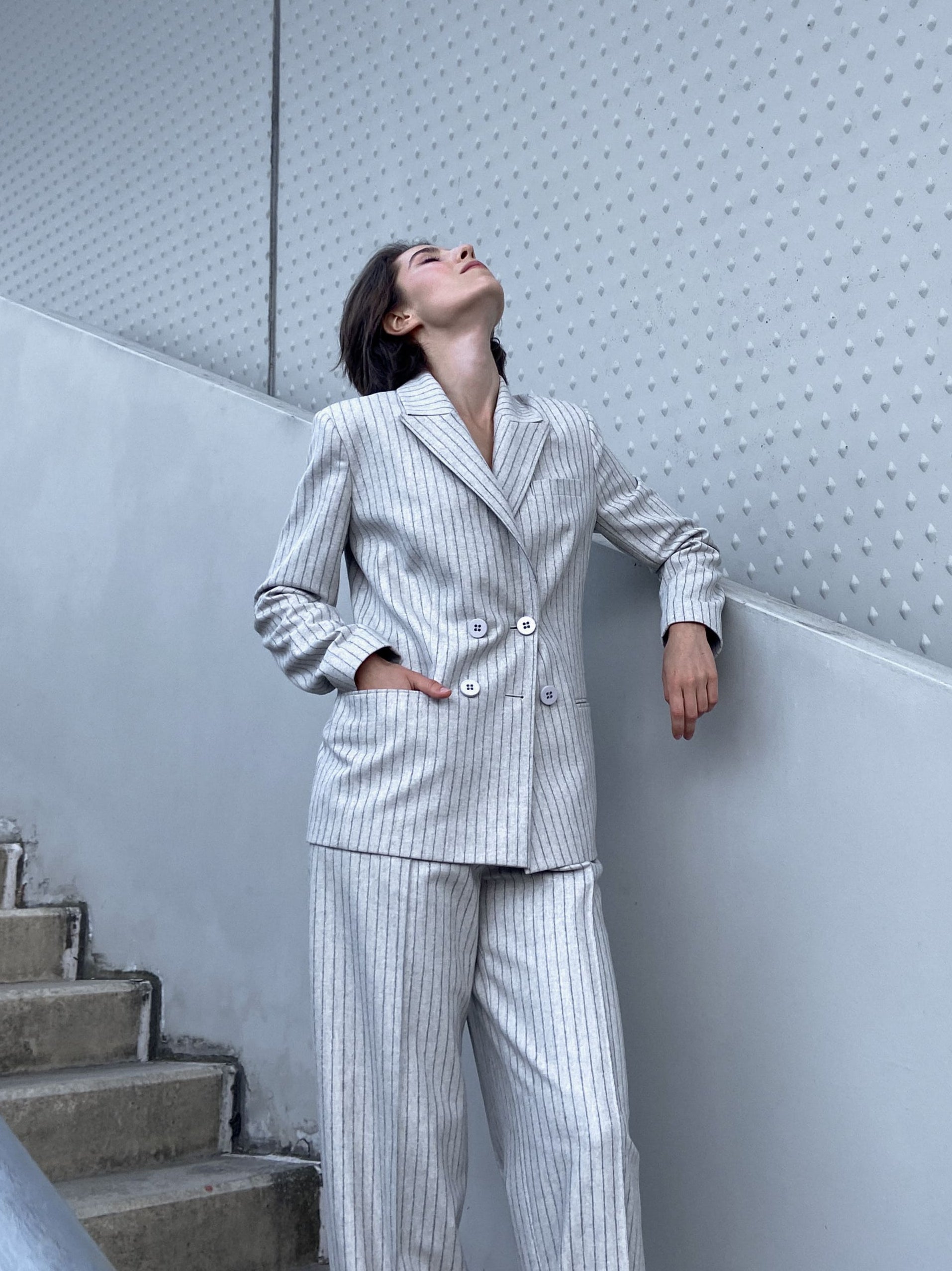 An elegant double-breasted blazer with a four-button fastening in a subtle grey pinstripe pattern, featuring perfectly aligned fabric design. Made from Italian wool dead-stock fabric, it combines luxury with sustainability. The semi-fitted silhouette flatters the body shape, making it an ideal choice for both business meetings and casual looks. This blazer embodies timeless elegance and impeccable style.