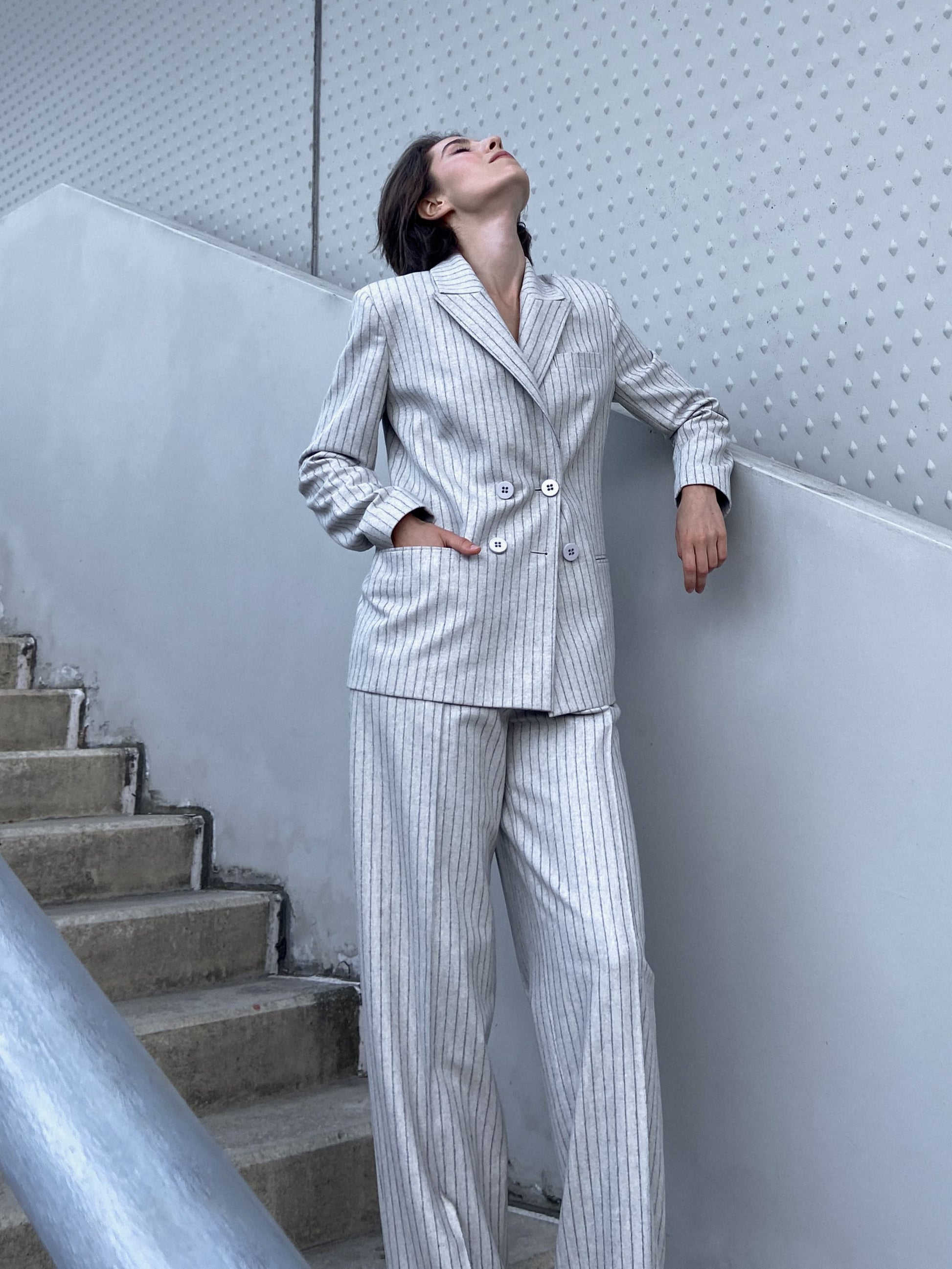 Elegant women’s full-length trousers in a men’s style with two pleats in the front, a high waist, and a subtle grey pinstripe pattern. Featuring a straight silhouette and knee-length lining. Equipped with pockets, these trousers offer a refined yet contemporary look, perfect for both office and casual outfits.